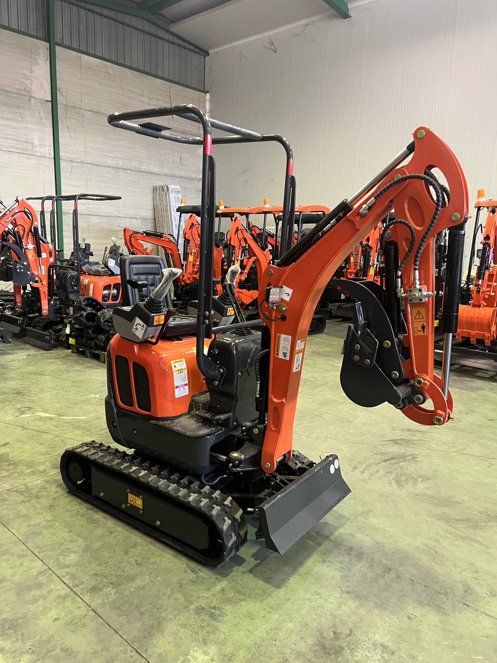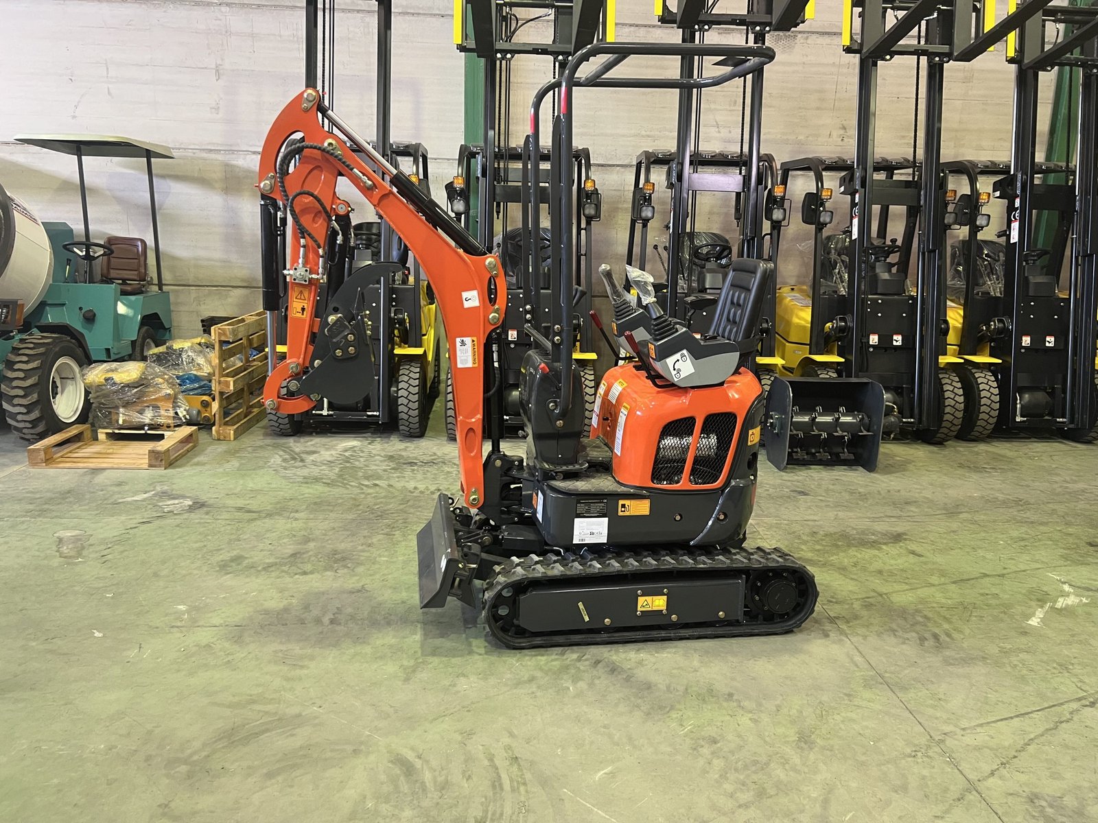 Mini-pelle 1 200 kg avec moteur Kubota 3 cylindres, compacte et très maniable grâce à ses chenilles rétractables (74 cm), parfaite pour les travaux en espaces restreints, chantiers urbains et aménagement paysager.