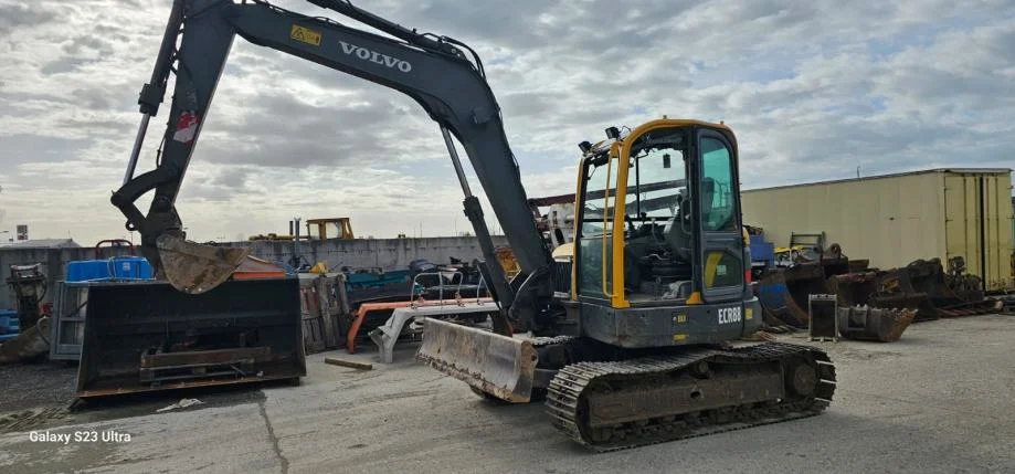 Mini-pelle Volvo EC88 de 8,3 tonnes, robuste et performante, équipée d’un moteur diesel 42 kW, cabine climatisée, attache rapide hydraulique et 3 godets inclus, prête à travailler avec garantie 12 mois.