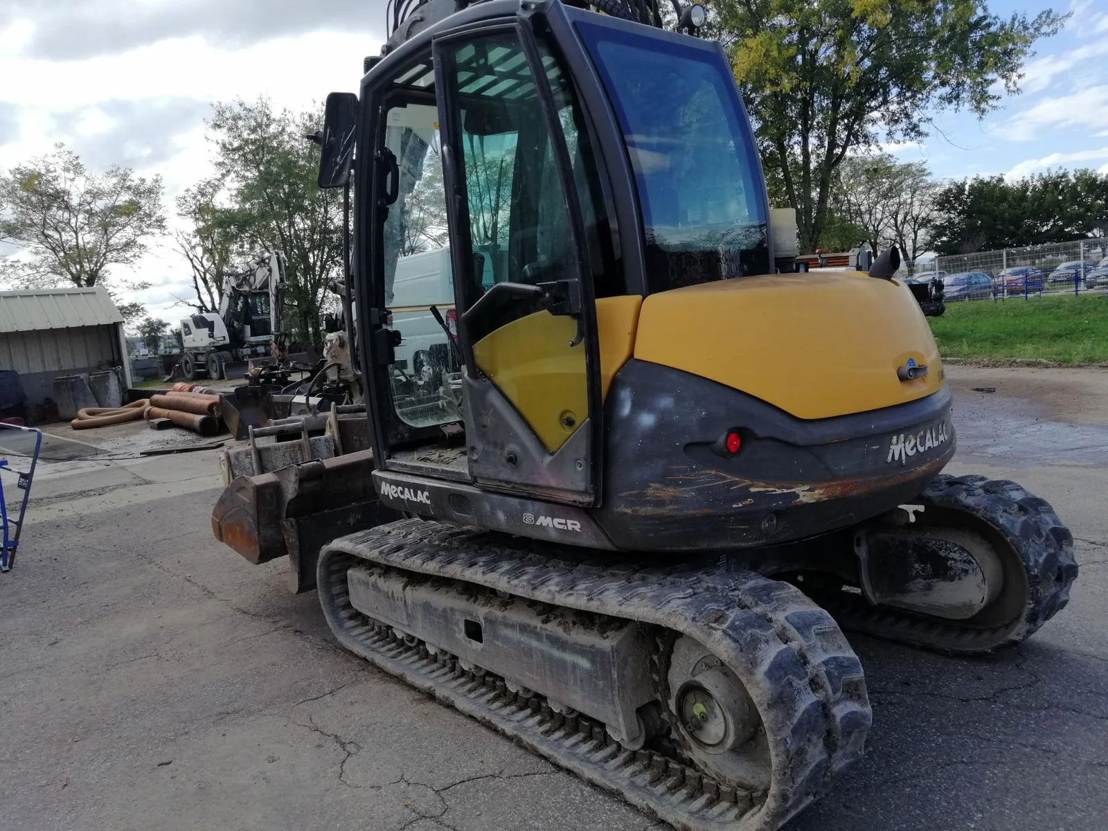 Pelle sur chenilles Mecalac 8 MCR (2015), 8 tonnes, livrée avec 4 godets. Compacte, maniable et polyvalente pour chantiers urbains et travaux intensifs.