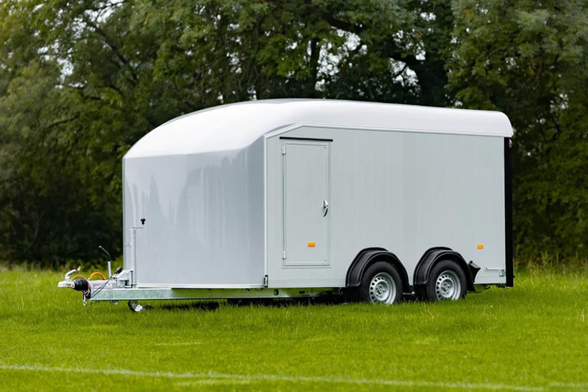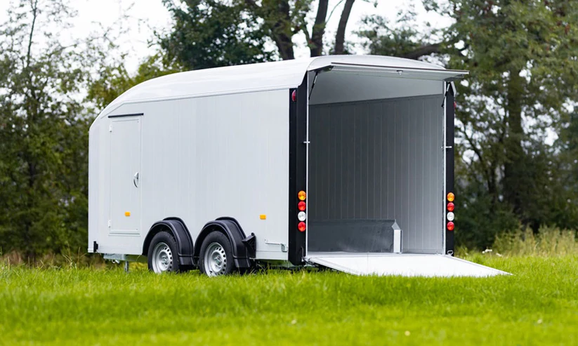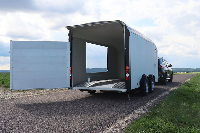 Remorque fourgon haut de gamme, conçue en monocoque fibre de verre avec parois aluminium aérodynamiques. Robuste, totalement étanche et parfaitement adaptée au transport de motos, matériel professionnel ou marchandises sensibles.