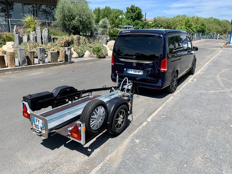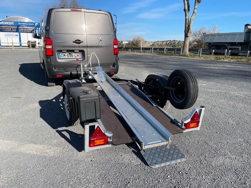 Remorque moto fiable et stable, parfaitement adaptée au transport sécurisé de vos deux-roues, que ce soit pour un usage privé ou sportif.