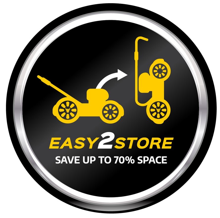 Le guidon ergonomique avec poignée SoftGrip, réglable en hauteur, offre une prise en main confortable. Un indicateur LED intégré au guidon permet de suivre en permanence le niveau de charge de la batterie. Pour un rangement pratique, la tondeuse peut être stockée verticalement, réduisant l’encombrement jusqu’à 70 %.